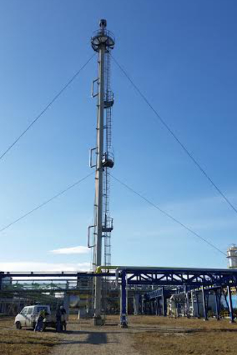 Di solito il gas flaring sopra i 250 °C impedisce l’uso di strutture strallate. È realistico anche dire che oltre 150 m di altezza della torcia, la struttura strallata non è un design pratico. Per ridurre i problemi di manutenzione, è necessario utilizzare funi metalliche anziché in fibra e le corde e i raccordi sono zincati a caldo.
